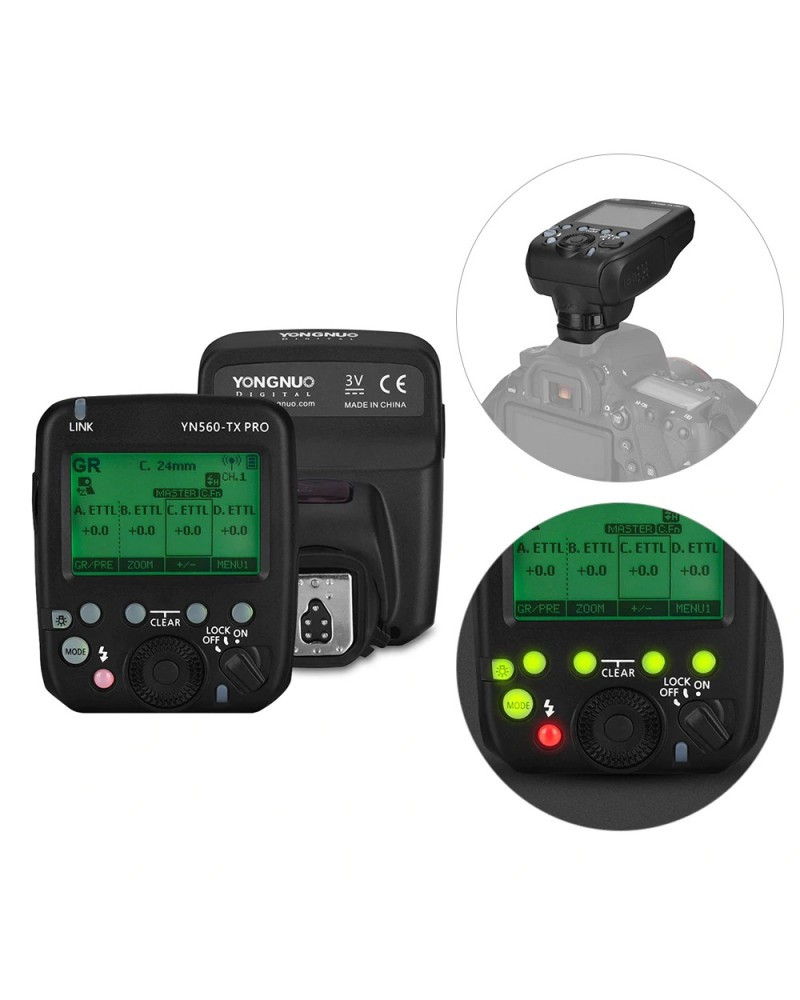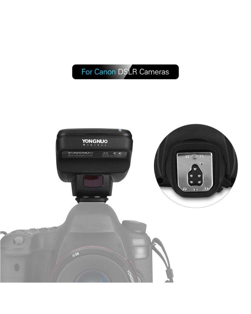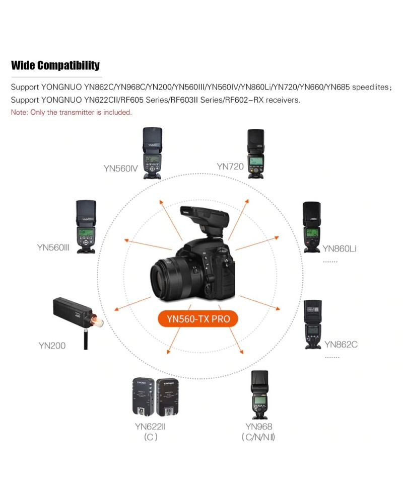 Adopt 2.4G wireless technology, support wireless trigger to YN862C/YN968C/YN200/YN560III/YN560IV/YN860Li/YN720/YN660/YN685 speedlite; Support wireless shutter receiver of YN622CII/RF605 Series/RF603II Series/RF602-RX.