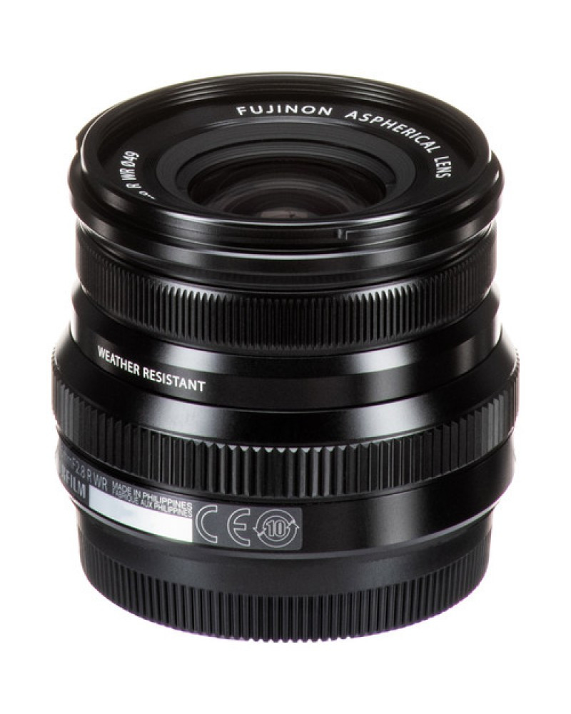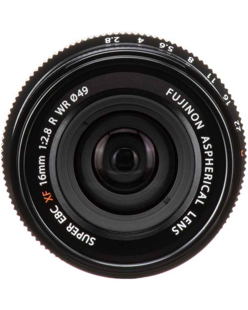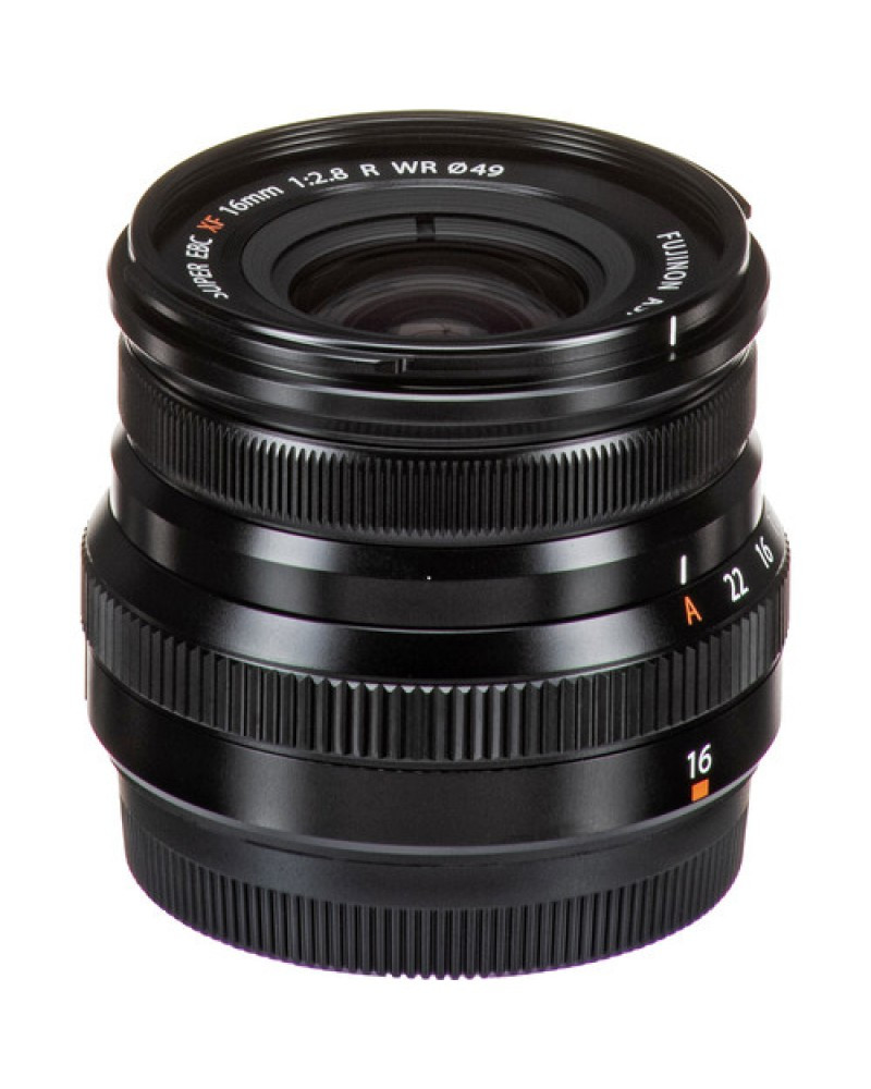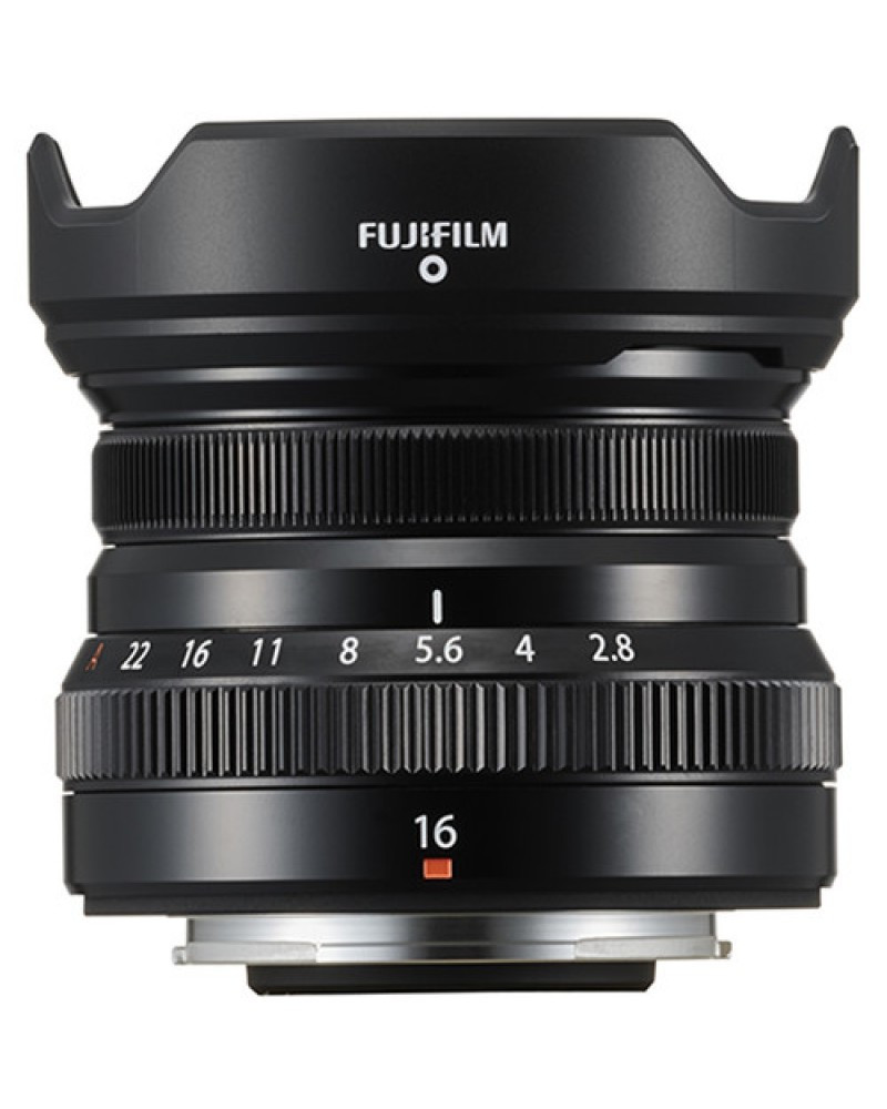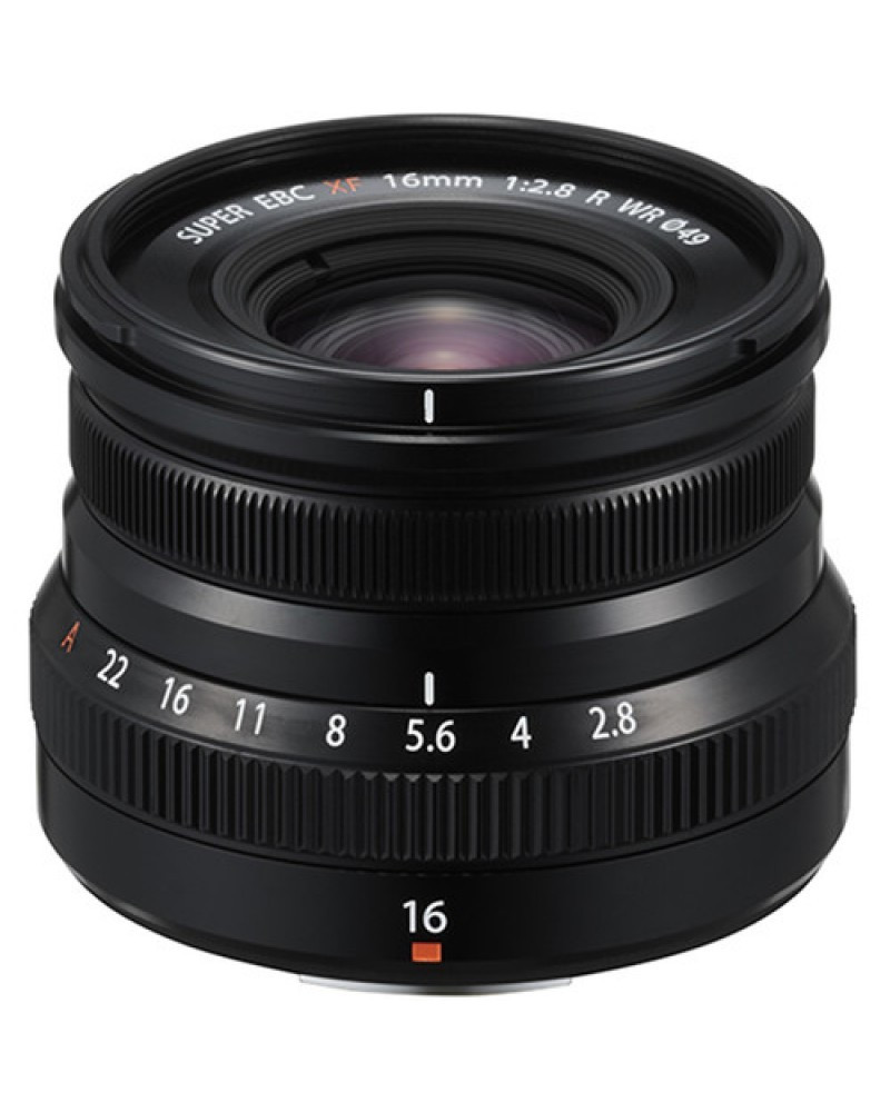 Continuing FUJIFILM's series of compact, portable primes, the black XF 16mm f/2.8 R WR is a 24mm-equivalent wide-angle lens, well-suited to landscape, nature, and architectural shooting. Its f/2.8 maximum aperture balances size and speed, and is suitable for working in available lighting conditions while also limiting the overall size and weight of the lens for everyday use. The optical design features two aspherical elements to reduce distortion and spherical aberrations in order to produce greater sharpness and accurate rendering. A Super EBC coating is also used to control flare and ghosting for improved contrast and color fidelity when working in bright and backlit conditions. Complementing the optics is a stepping motor, along with an internal focusing design, which provides quick and especially quiet focusing performance. Additionally, the lens is weather-sealed to suit working in inclement conditions.