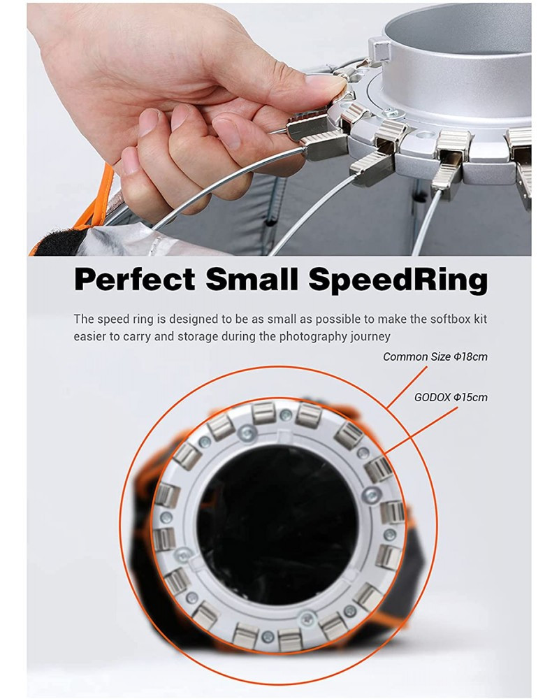 The QR series softboxes are new multi-purpose deep parabolic softboxes launched by Godox. The unique quick-loading design makes it easy to disassemble and store, which greatly improves shooting efficiency while maintaining the brightness, color temperature, and high CRI of the light source; the QR series Softbox has the advantages of large depth, rich layers, uniform illumination, and soft light effects. It is an ideal choice for video shooting, live recording, and interview lighting.