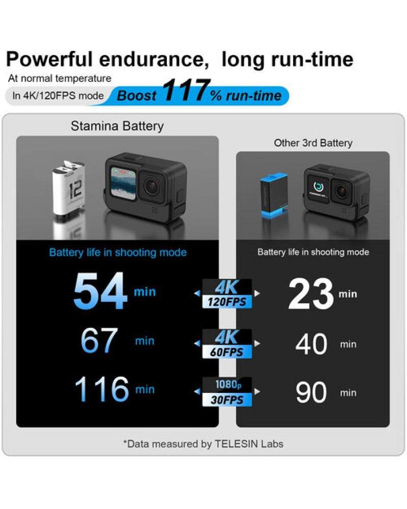 Power your GoPro HERO12, HERO11, HERO10, or HERO9 Camera with this 1720mAh Stamina Battery from TELESIN. The battery is fully decoded, so it'll display the remaining battery life on the camera display, just like the original GoPro battery. This battery is designed to last up to 100 minutes of HD recording time, 45 minutes of 4K120 recording time, and it can be used in cold temperatures down to 5°F.