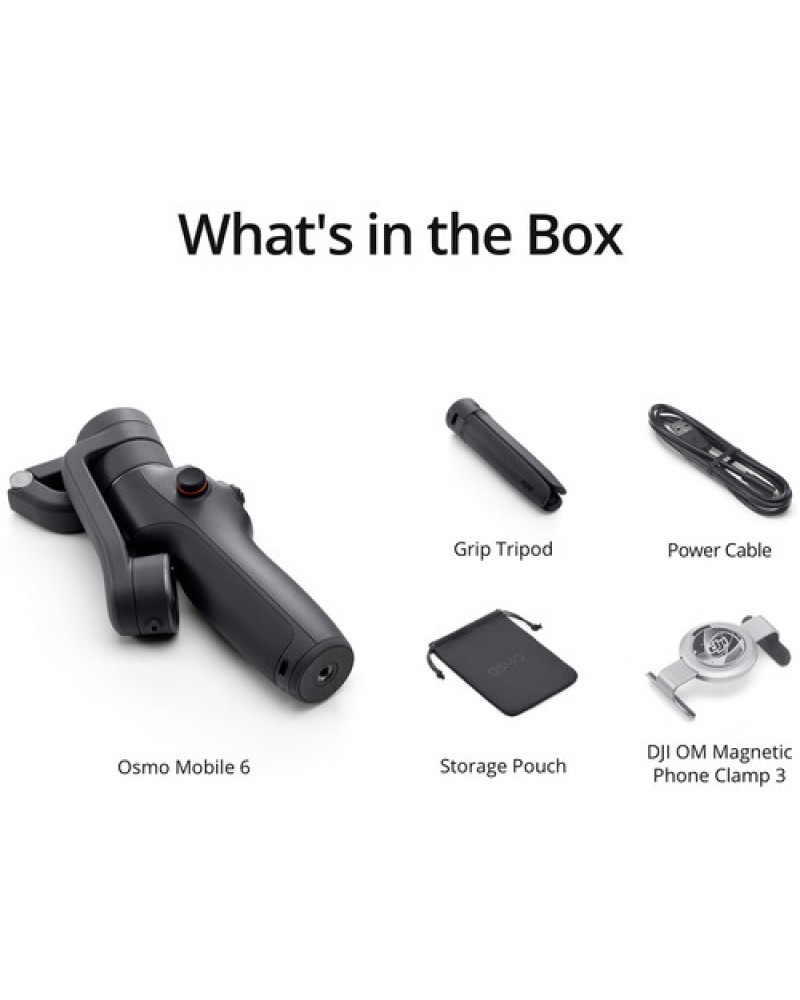 Improving on the previous OM 5 gimbal stabilizer, the black DJI Osmo Mobile 6 Smartphone Gimbal stabilizer comes in an even more compact frame that's easier to balance and fold down, and it now features an extension rod that provides an additional 8.5" length to help design more creative shots. It also comes with an improved magnetic phone clamp that allows the gimbal to automatically detect your phone and aligns the clamp. You can mount any smartphone up to 3.3" wide in its phone cradle, and its magnetic phone holder allows for simple and fast mounting and unmounting. The integrated intelligent sensor even tells you when your smartphone is mounted. The built-in battery runtime is approximately 6.4 hours, and it takes approximately 1.5 hours to charge using the included USB-C cable. The bottom of the gimbal handle features a mounting thread to mount the gimbal on the included grip tripod or other accessories. A storage pouch is also included to store and transport the gimbal.