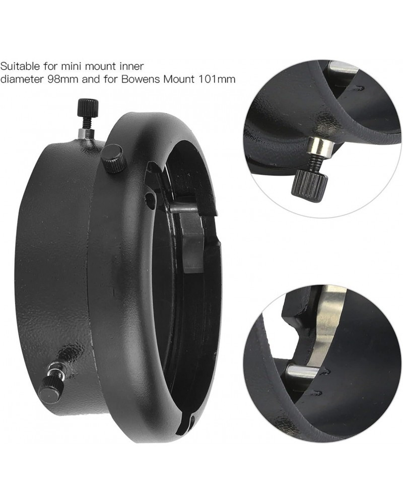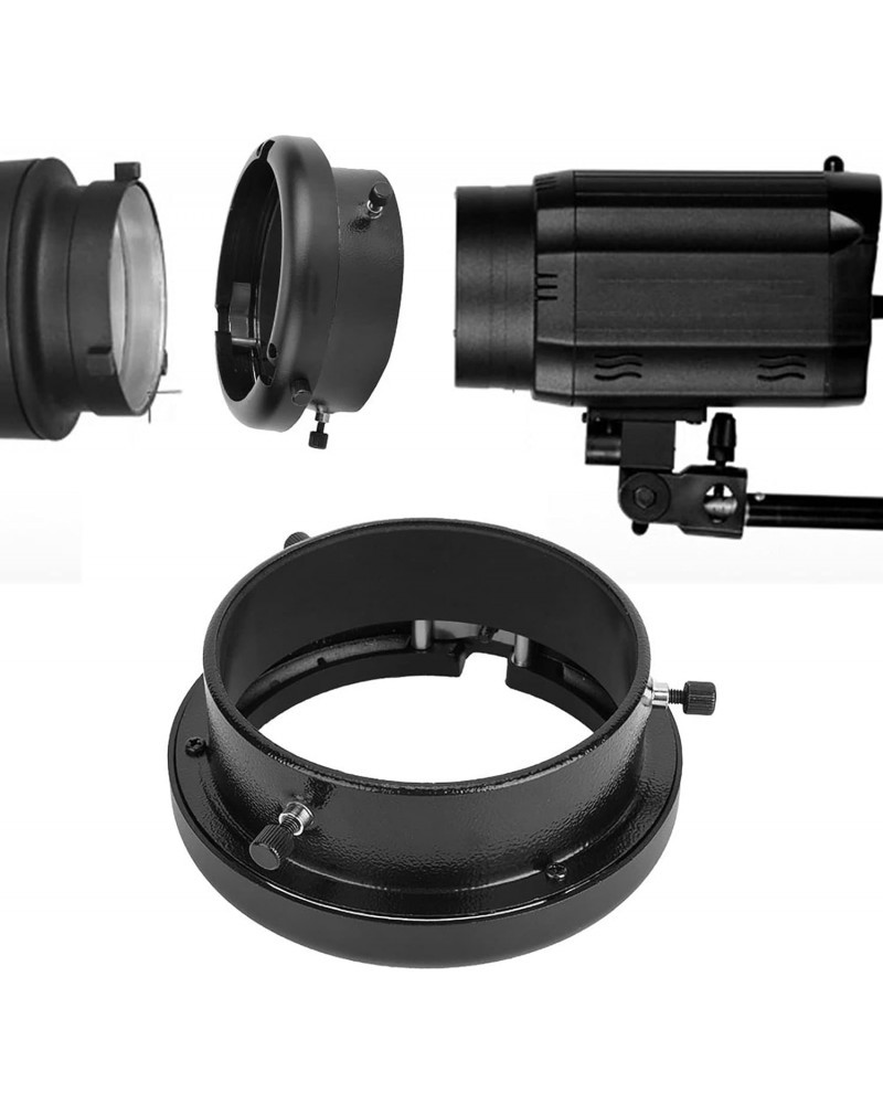 When used with a "Bowens" mount Softbox or other photography accessories, buyers can use this ring adapter to fit a 9.5cm diameter universal mini mount strobe flash light.