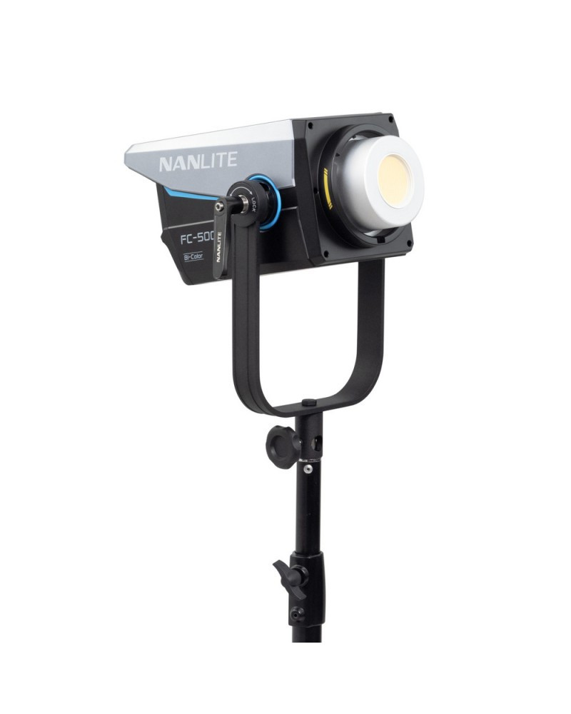 The Nanlite FC-500B is an AC-powered, bi-color LED spotlight that provides an immense amount of light in a compact, lightweight, and stylish package. You can quickly fine-tune the dimming from 0 to 100% in 0.1% increments, and with the twist of a knob achieve a wide range of looks, from warm indoor tones to bright daylight with its CCT range of 2700K-6500K. The high CRI rating of 96 and TLCI of 98 means your skin tones and other colors will always be accurate. It has easy-to-use onboard controls, Bluetooth for the free NANLINK app for iOS and Android, and 2.4G for more wireless control options. A locking, metal 3.5mm port even lets you control with DMX/RDM.