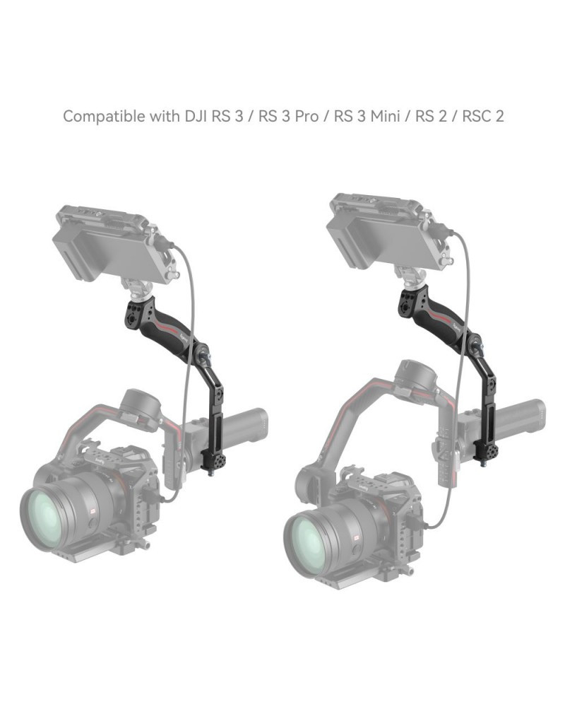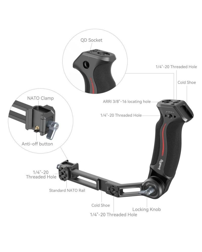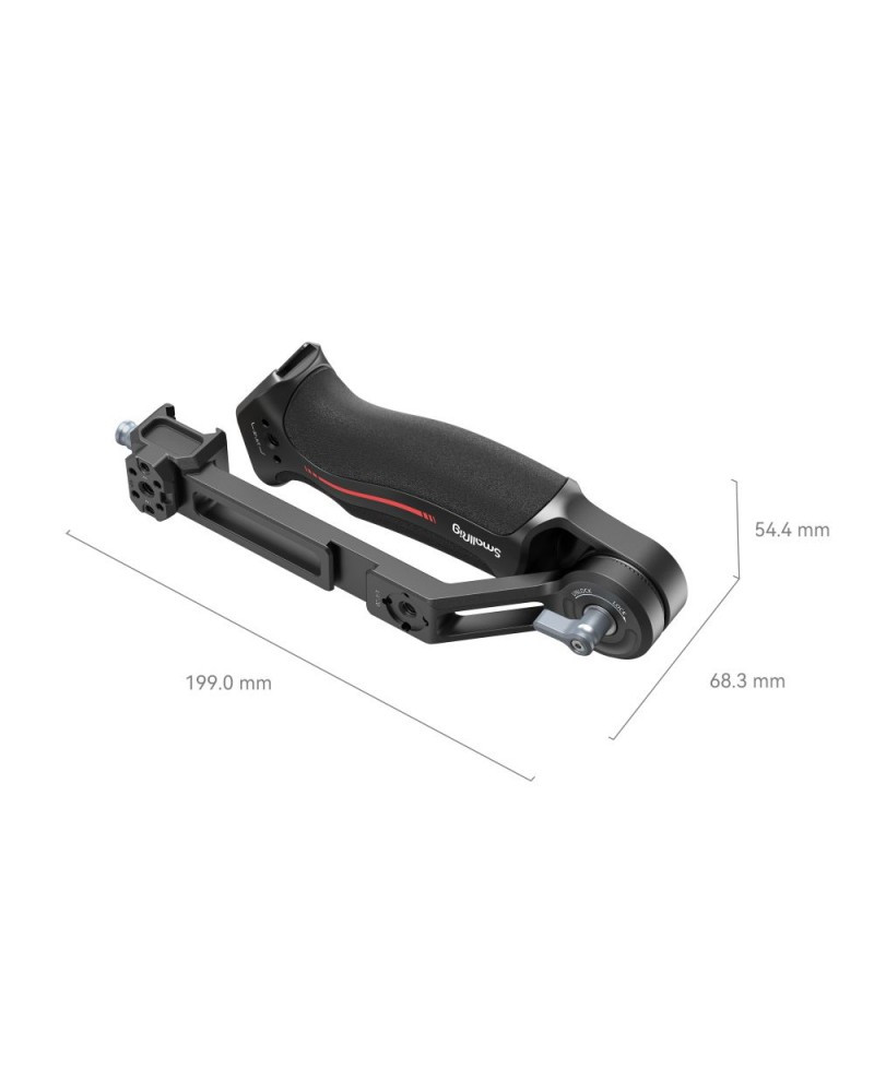 SmallRig Sling Handle for DJI RS 2 / RSC 2 / RS 3 / RS 3 PRO / RS 3 mini 3028C is designed to reduce arm fatigue during low-angle shooting and offers plentiful accessory mounting options. Equipped with a NATO rail for connection and features a locating pin to ensure safe and quick operation. Multiple 1/4”-20 threaded holes and ARRI 3/8”-16 location holes are built-in on the handle which allows for mounting Magic Arm 2115 and Monitor Mount 2903. With two cold shoe mounts on top and side of the handle, it can be mounted with Wireless GO and a sound receiver. Side NATO rail can attach the Monitor Mount 3026B. The handle’s angle can be adjusted to 180° via a ratchet knob and can be used as a side handle to meet the needs of different shooting scenarios. Ergonomically-designed & curved grip with anti-slip silicone gives you more comfort while holding it. Its sleek design and compact structure match perfectly with the stabilizer.