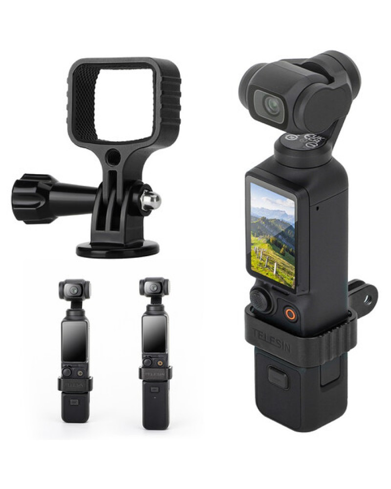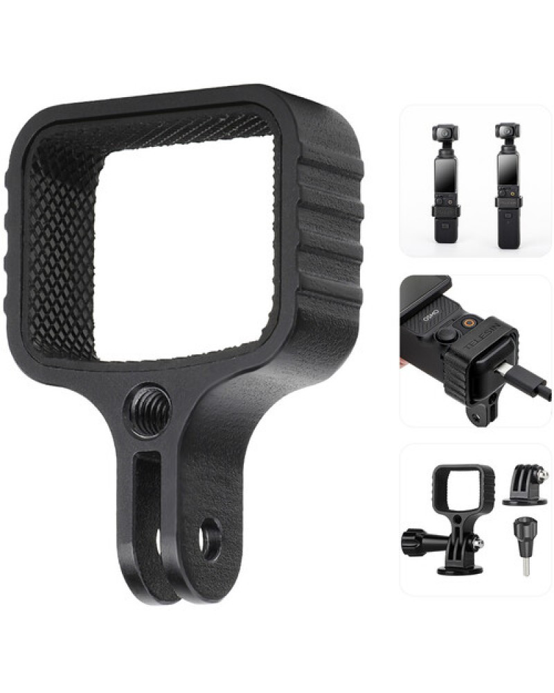 Mount your DJI Osmo Pocket 3 gimbal camera onto a variety of mounts using this Metal Extension Frame from TELESIN. The aluminum frame mounts around the base of your Pocket 3 and provides a 2-prong action camera mount to the gimbal camera. It does not block any of the camera's buttons or ports.