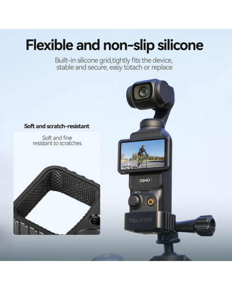 The interior of the mount is lined with soft silicone to provide grip and to prevent scratching. A 3-prong to 1/4"-20 thread adapter and a thumbscrew are also included for mounting the Pocket 3 onto a tripod, stand, clip, or other mount.