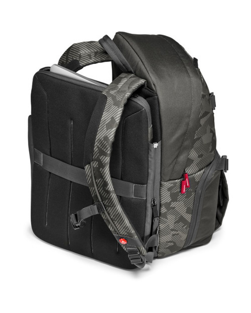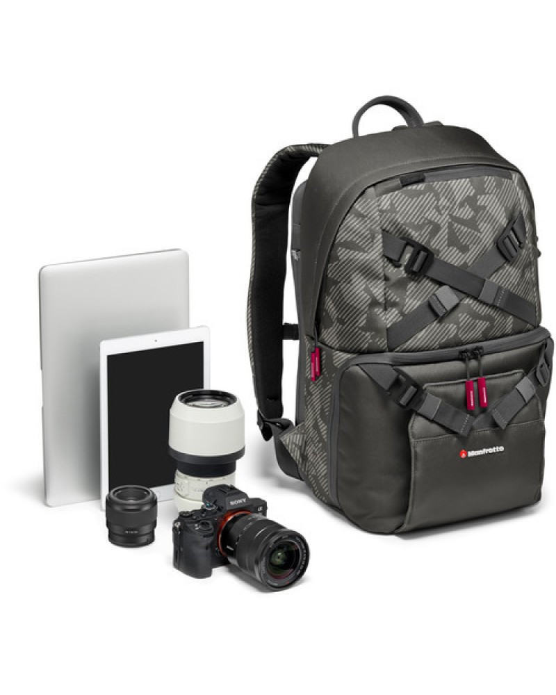 For your peace of mind, this backpack features the Manfrotto Protection System, which is guaranteed to protect your gear from shock. A tripod holder on the front enables you to always have your travel tripod with you. A pocket and a bungee cord on the side accommodate a selfie pole to shoot your adventures while you walk with your 360°camera. Whatever gear you decide to take with you, your bag is the perfect carrying solution! With its stylishly understated look, it is the perfect companion for your daily adventures! Materials and details have been selected with the greatest care: the camouflage texture and cross-positioned straps strongly characterise this bag. It redefines a highly distinguished new personal urban style. All external fabric is treated to make it water repellent and a rain cover is also supplied in case of extreme weather conditions.