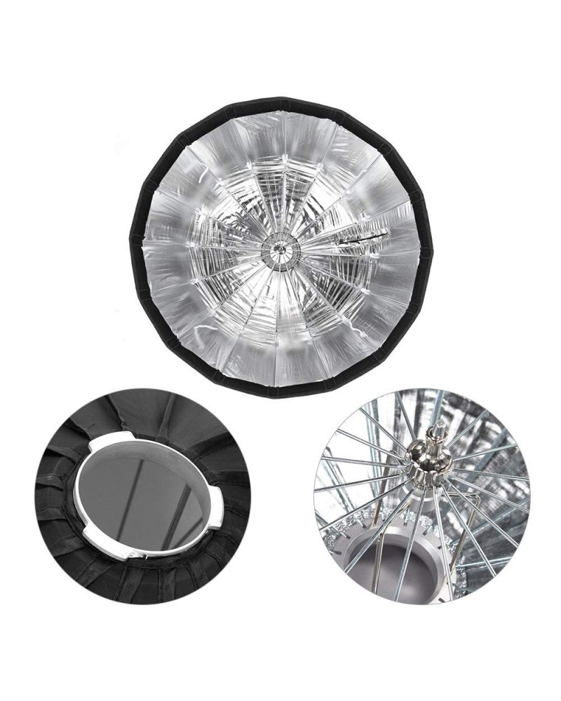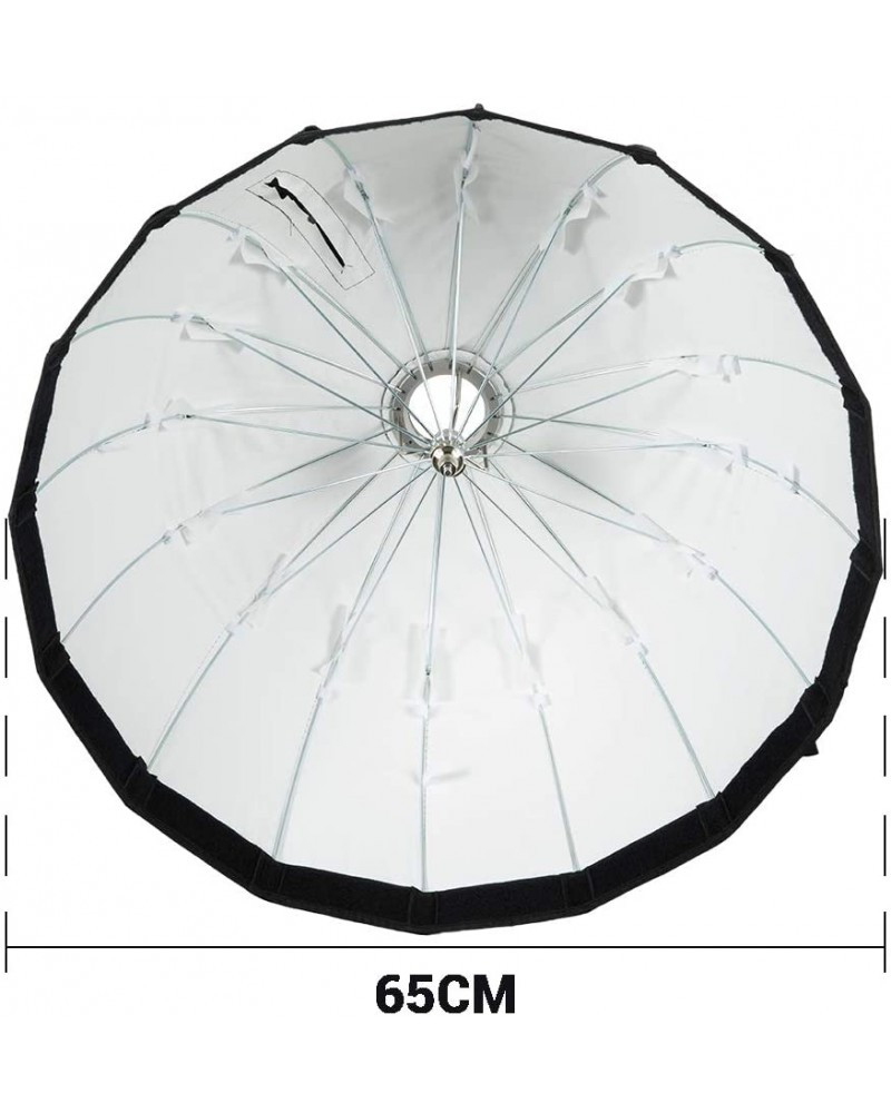Parabola design with 16 pieces of pole, nearly round shape. With reflector, diffuser, and grid to create softer light effect.