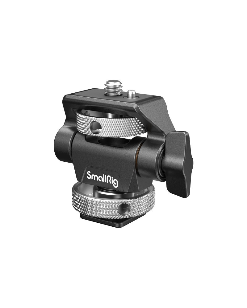 SmallRig Swivel and Tilt Adjustable Monitor Mount with Cold Shoe Mount 2905 is designed to hold your monitor for easy monitoring. It comes with a bottom cold shoe for camera hot shoe, cage or handle and a top 1/4"-20 screw for monitor, microphone, light, etc. The mount can tilt 180° and and swivel 360°. Its tilt axis is quickly tightened via a knob to suit different weight and features tested durability, with tilt load capacity decreased by no more than 20% after 10,000 tilts, while its pan axis is 360° adjustable via an Allen wrench. Bouncy locating pins on the top help secure Ninja V/ V+; and 1/4"-20 threaded holes at the bottom allow attaching Magic Arm 2070, etc. Both thumbscrews have holes for Allen wrench to facilitate assembly and disassembly.