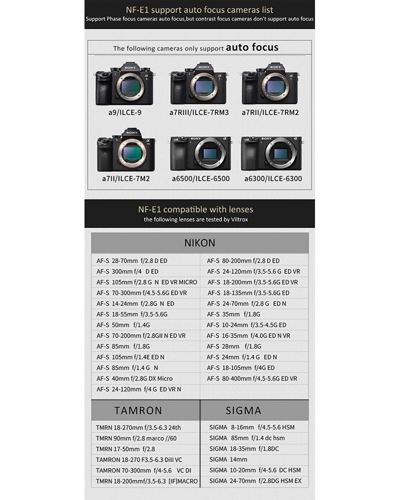 Compatible Camera: Sony E Mount series.(Sony A6300 A6500 A9 A7II A7III A7R A7RII A7RIII)