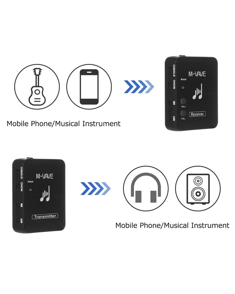 2.4GHz wireless transmission band, 24 bit/48KHz sample rate.