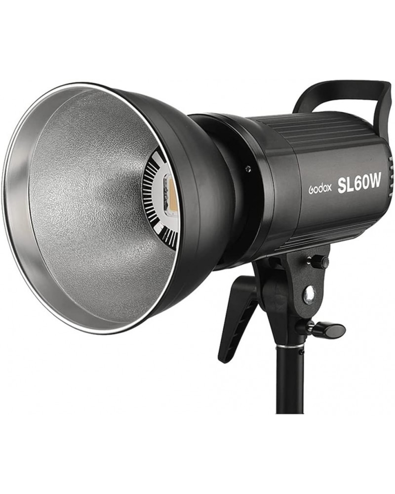 SL-60 LED Light from Godox is a daylight-balanced, 5600K light featuring a COB (chip on board) LED for high brightness and color accuracy. The intuitive design of the light incorporates a rear LCD monitor and a dial with a 10-100% dimming adjustment. A dedicated well as for grouping lights for multiple light configurations. Also, to help ensure consistent and continuous use, a heatsink and built-in fan are featured to help regulate temperature along with a specialized temperature control function to protect the LED itself. The light is also configured to accept Bowens S-mount light modifiers and accessories, such as the included reflector, and the LED also has a clear cover over it for additional protection.