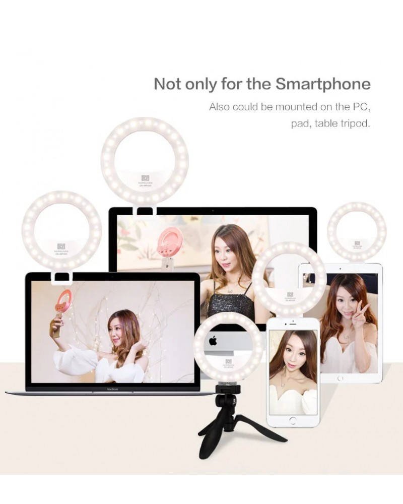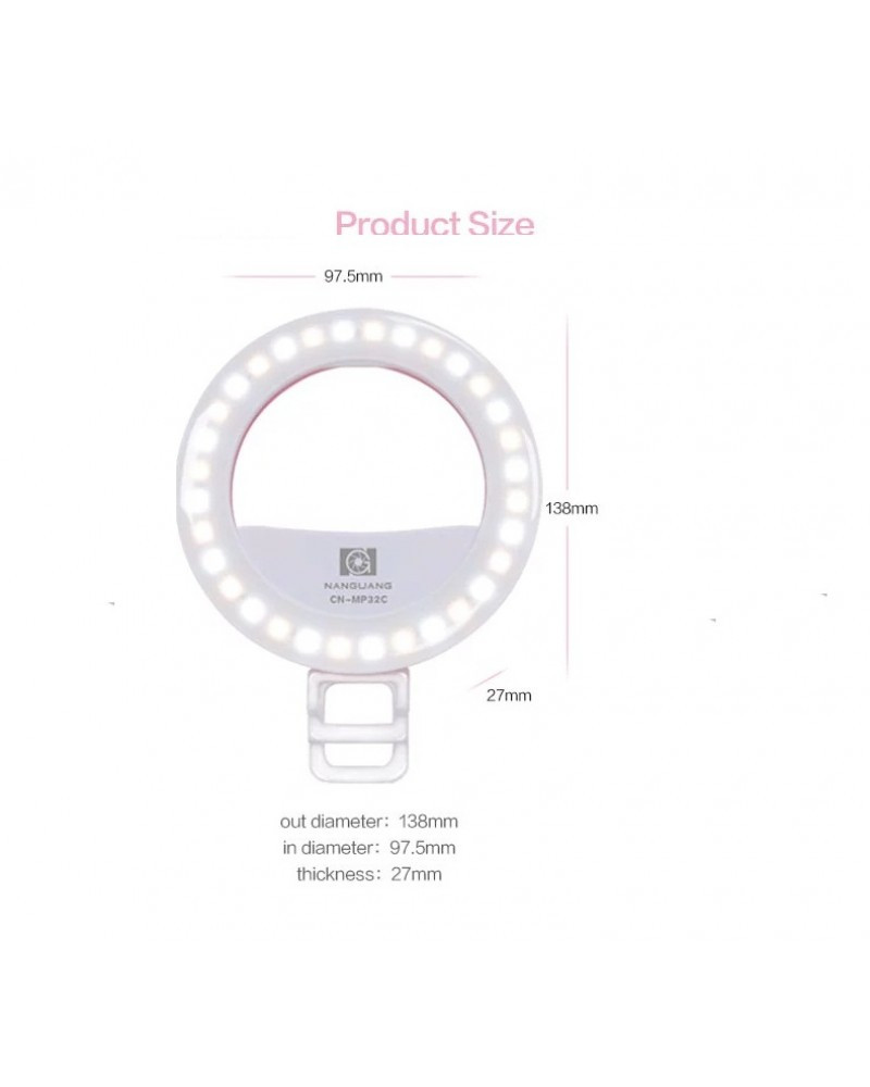 Ring selfie light with 32pcs LED lights provide supplement and side lighting for photography in dim dark light condition, soft and even illumination to make your selfie looks stereoscopic and glossy.
