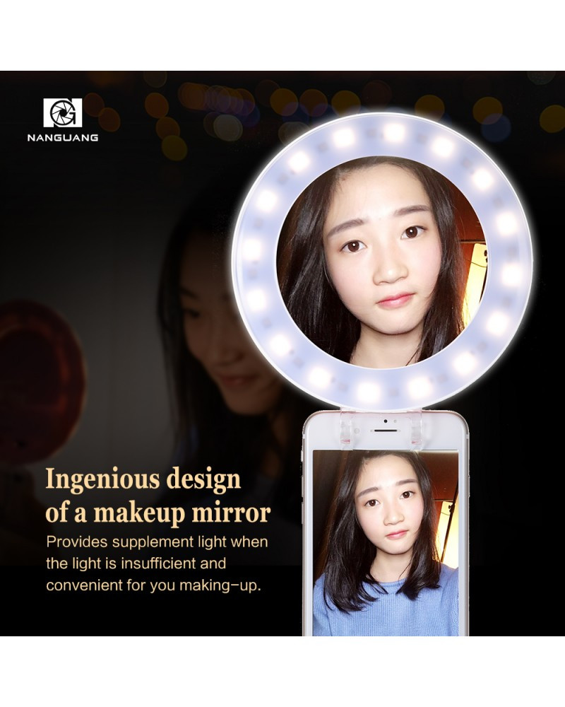 NANGUANG CN-MP32C ring selfie fill-in light with soft and even illumination to make your selfie looks stereoscopic and glow. It features 32pcs LED, 3200K-5600K bi-color temperature, with brightness adjustment knob, stepless control for you to adjust the effect for different light setting, high CRI 95 to produce more natural illumination, USB input or battery for power supply, comes with mirror for portrait shooting conveniently, carry bag and 2 * smartphone clip included.