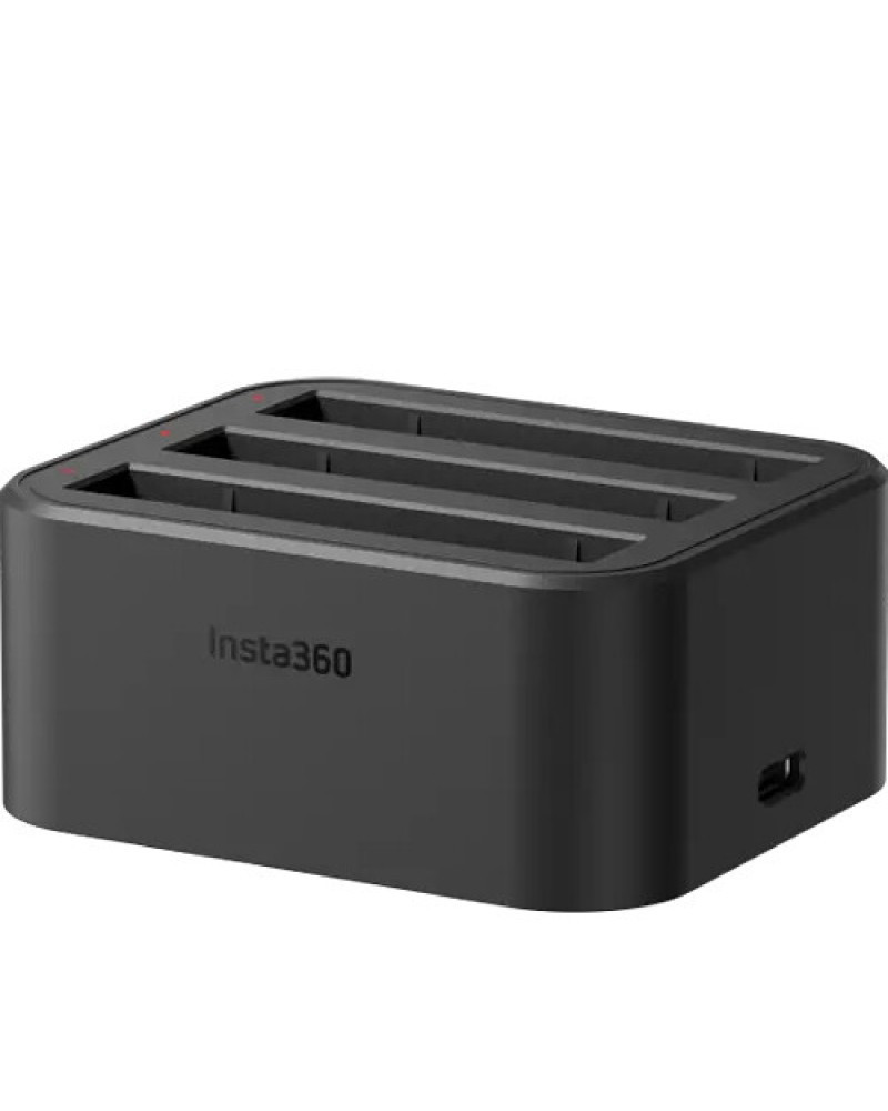 The Fast Charging Hub for the Insta360 X3 camera charges up to three X3 batteries simultaneously. Batteries charge in approximately 90 minutes, with an LED above each battery slot confirming whether the battery is charging, charged, or not charging because of malfunction. A USB-C charging port provides power to the hub, and overcharge protection ensures intelligent charging management.