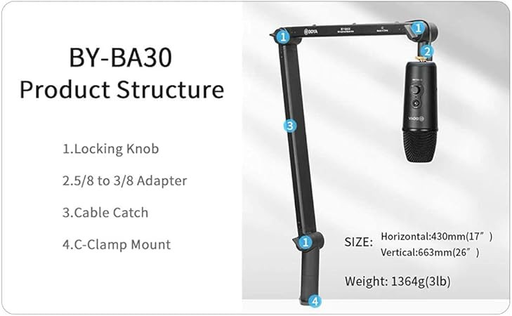 The BOYA BY-BA30 is a microphone boom arm,giving users with experience improvements when using their microphone.It can provide a maximum arm reach of 17"(horizontal length)/26"(vertical height).