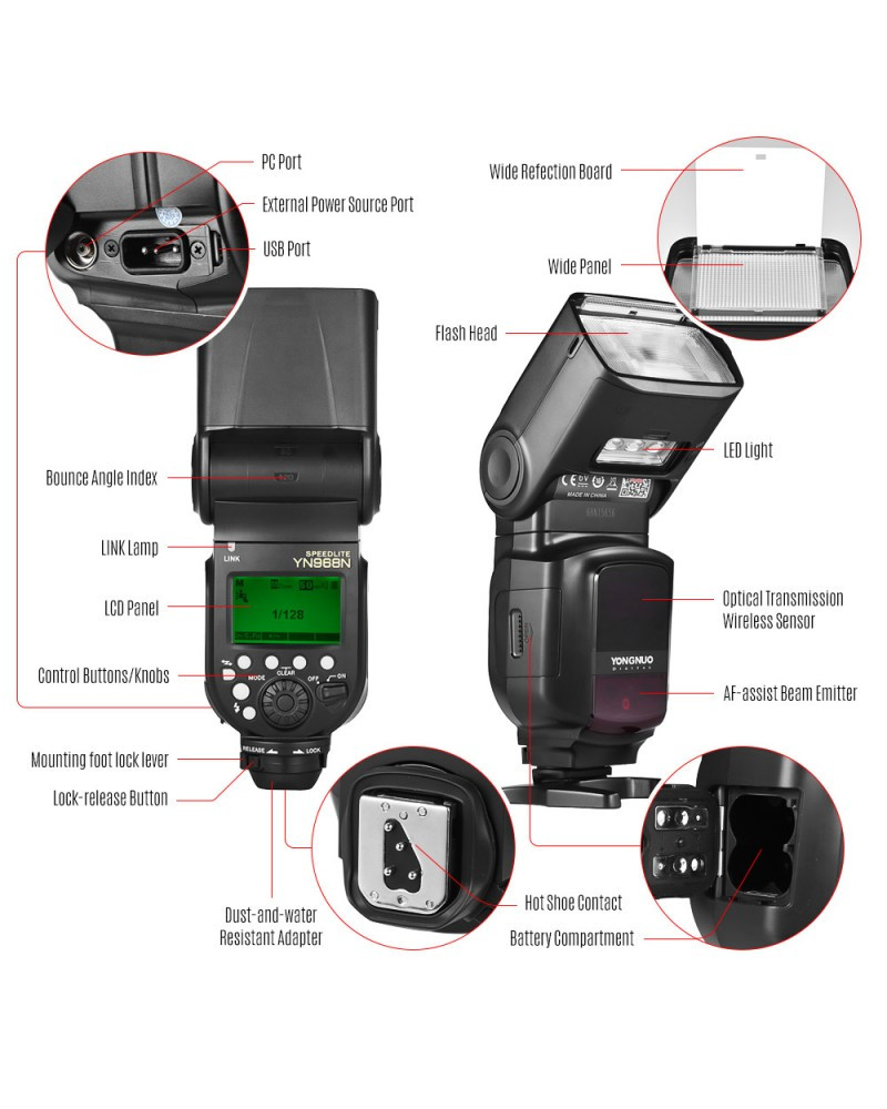 Additional Features: Master flash, high-speed sync, second-curtain sync, FEC, FEB, FVL, the electronic flash head zooming, sound prompt, automatically saving setting, PC port, power saving mode, overheat protection, custom functions (C. Fn), personal functions (P. Fn)