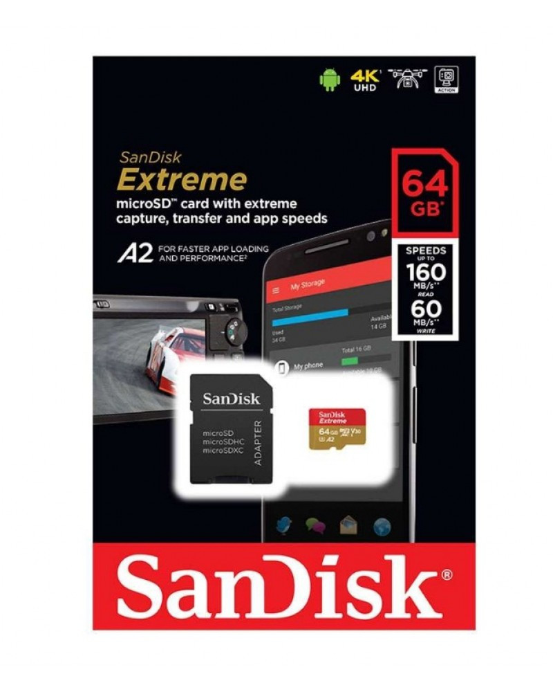 Get extreme speeds for fast transfer, app performance, and 4K UHD.2 Ideal for your Android™ smartphone, action cameras or drones, this high-performance microSD card does 4K UHD video recording, Full HD video and high-resolution photos. The super-fast SanDisk Extreme® microSDXC™ memory card reads up to 160MB/s* and writes up to 90MB/s.* Plus, it’s A2-rated, so you can get fast application performance for an exceptional smartphone experience.7