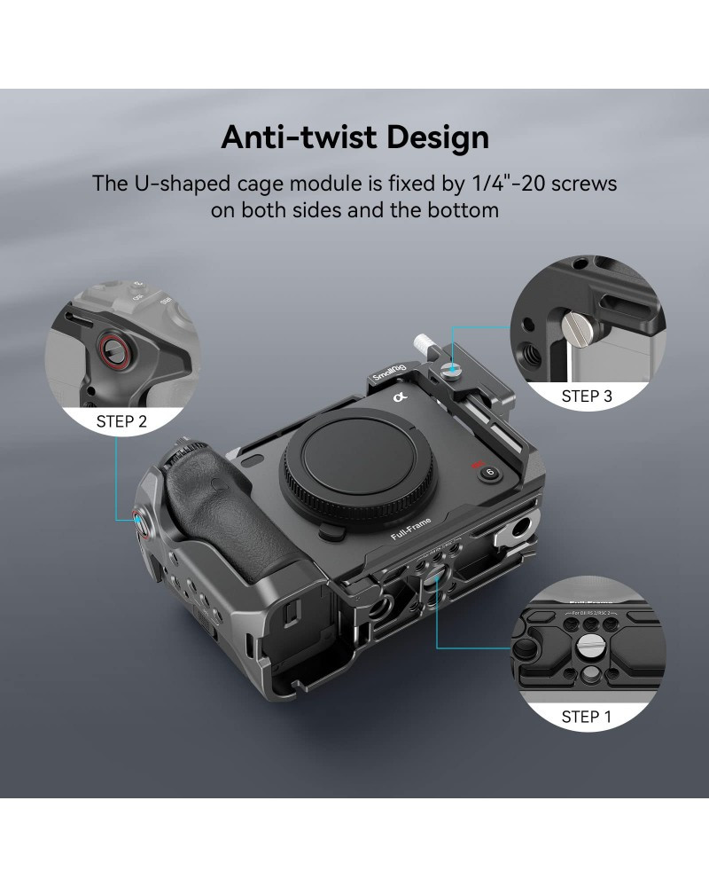 SmallRig Cage for Sony FX30 / FX3 4183 is designed to protect the camera and provide accessory mounting points. The modular cage consists of a NATO rail and a U-shaped cage. The NATO rail is secured on the top via two 1/4"-20 screws and removed to allow installing the original XLR top handle; the U-shaped cage is fixed via 1/4"-20 screws on both sides and at the bottom to prevent twisting, with a cushion against scratches. At the battery door, there is a hinge arm that fits the camera curve for an improved grip experience for a little finger. A dedicated HDMI cable clamp protects interfaces to ensure stable signal transmission. Among its varied accessory mounts, 1/4"-20 holes support Magic Arm 2070; ARRI 3/8"-16 locating holes connect Top Handle 2165C or Monitor Mount 2903B; the top NATO rail supports Top Handle 3322, and the left one, Side Handle 2187B; 1/4"-20 locating holes at the top-left quarter and on the left side attach Rod Clamp 3598 for follow focus; two 1/4"-20 holes on the right side allow being securely mounted onto a quick release plate for vertical shooting; the cold shoe mount supports microphone, LED light; and the QD port at the bottom fits QD strap. An Arca-Swiss quick-release plate at the bottom can attach DJI RS 2 / RSC 2 / RS 3 / RS 3 Pro directly or a quick-release plate (height increase pad) for DJI RS 2 / RSC 2 gimbal and Arca-Type Quick Release Plate 3154. Both sides and the bottom have holes for Hand Strap 3848 and Shoulder Strap PSC2428. A magnetic spanner is also included for easy assembly and disassembly.