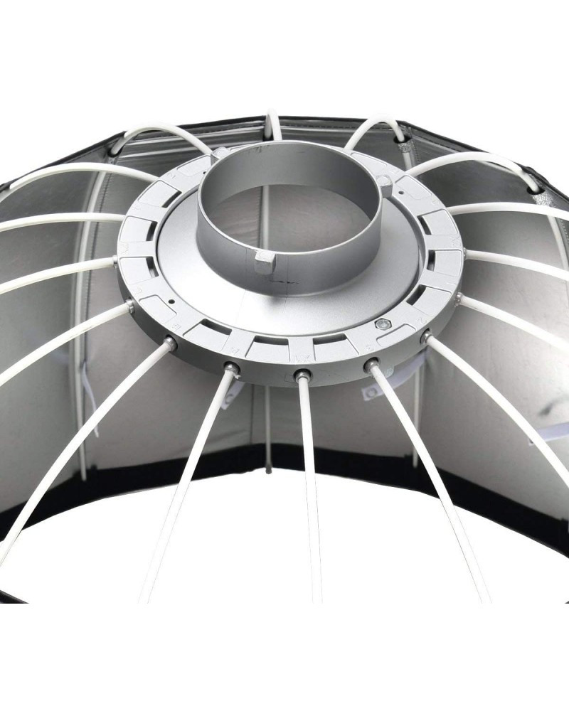 1. Open the softbox on the flat land, and symmetrically insert all 16 rods to the adapter ring.