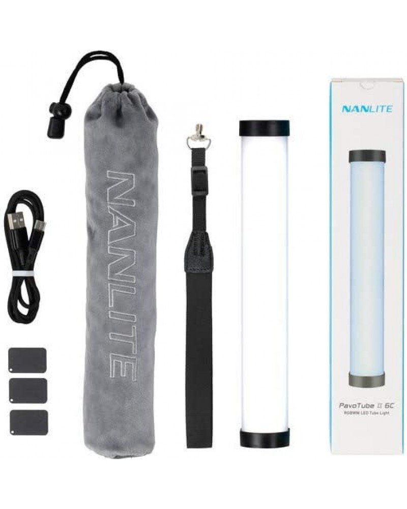 Flexibility is key to the Nanlite PavoTube II 6C 10" RGBWW LED Tube with Battery's design. The light has color temperature variable from 2700 to 7500K to blend in seamlessly with ambient light conditions, match other fixtures, or express creative effects. It also has an RGB mode that enables its red, green, and blue LEDs to select from 360 colors with hue control that produces a myriad of color combinations. Light intensity is variable as well, from 0 to 100%. The PavoTube II has a built-in rechargeable battery that will give you 65 minutes of runtime on a full charge at 100% power. It also has special effects including Hue Loop, CCT Loop, Int Loop, CCT Flash, Hue Flash, CCT Pulse, Hue Pulse, Storm, Police Car, TV, Paparazzi, Fire, Disco, Bad Bulb, Fireworks, Explosion, and Welding. The light is ready for worldwide use, charges via the included USB cable, and comes with a set of metal mounting plates. A padded carrying bag is also included.