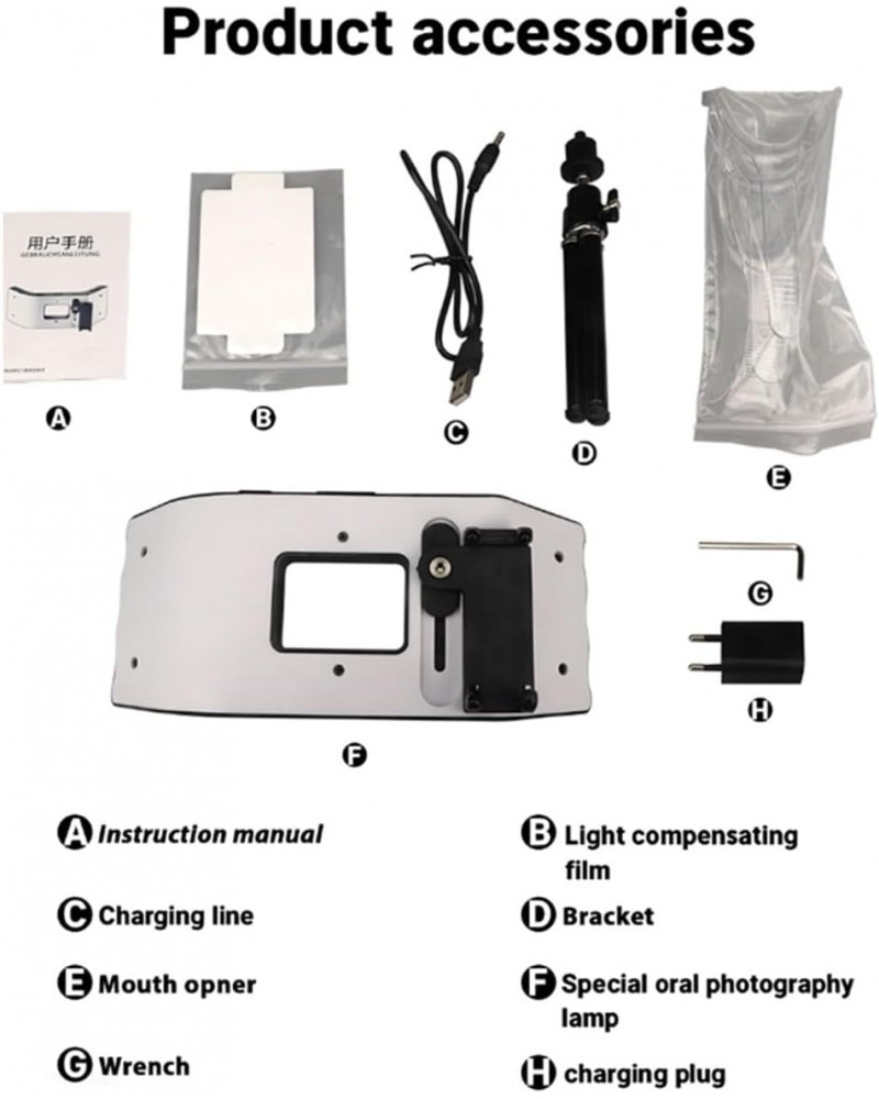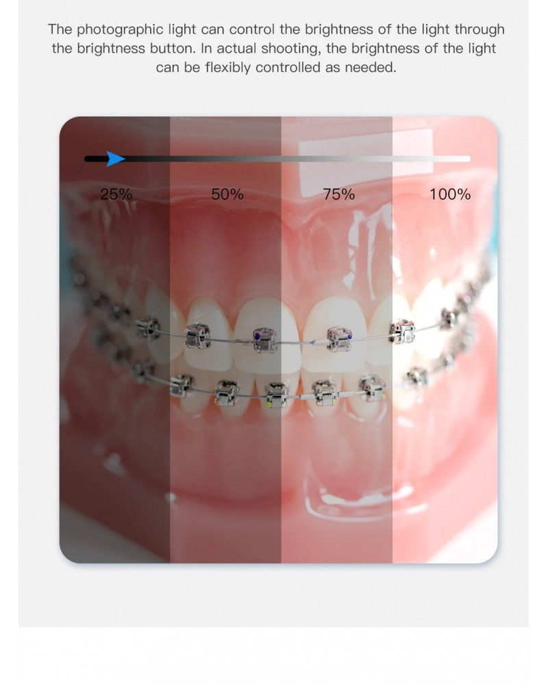 Dental Oral Photography LED Lamp Flash Light with Three Foot Bracket. The light is evenly illuminated, light wide range, precise color temperature. CRI up to 95+, realistic colors make treatment effects look better. The photographic light can control the brightness of the light through the brightness button.