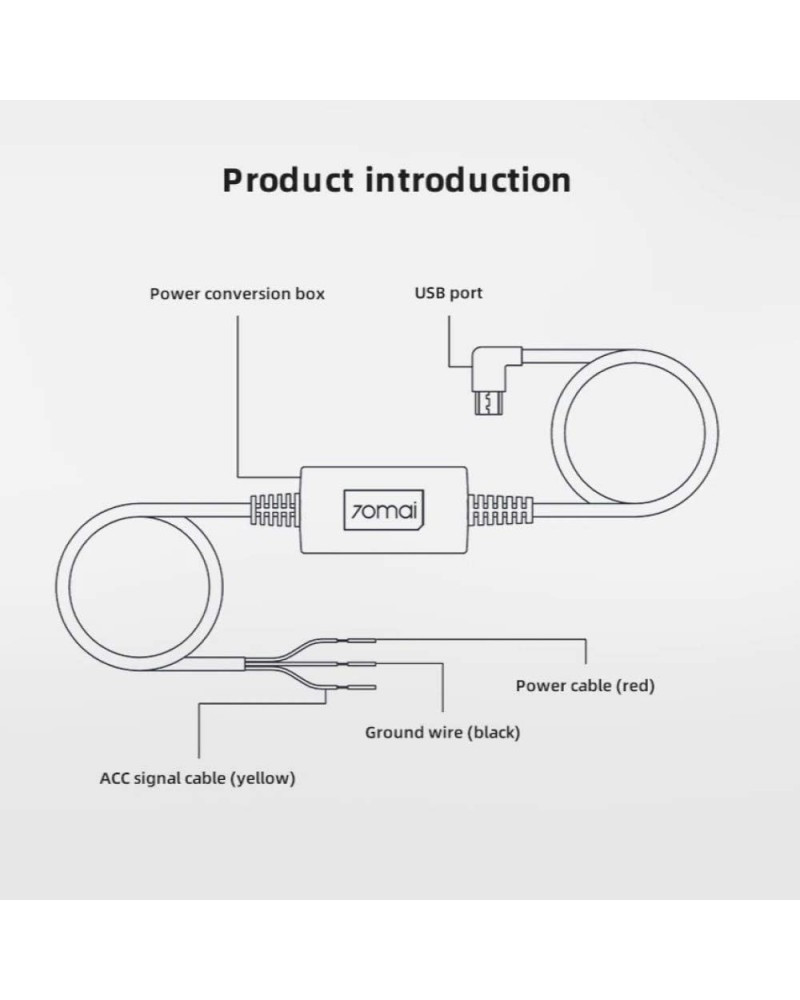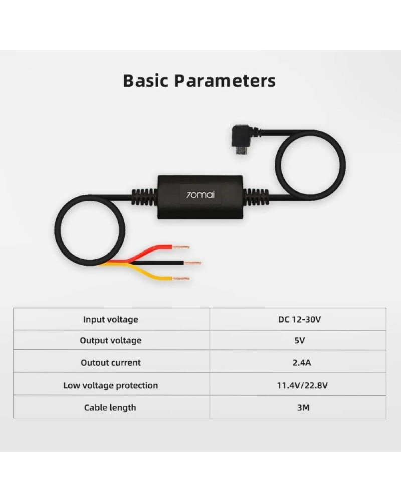 The 70mph mini USB Hard Wire Kit is used in conjunction with the 70mph parking surveillance cable to automatically enter vehicle monitoring mode when the vehicle is monitored and switched off.