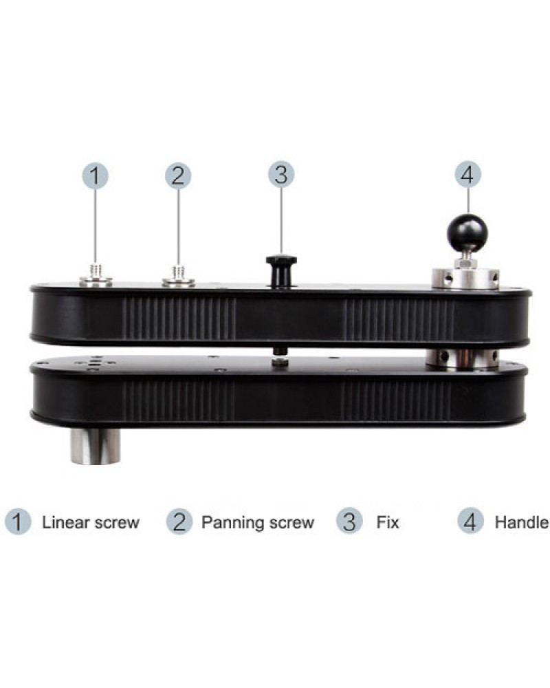 • The slider is equipped with two 1/4 inch screw threads. "PANNING" screw has following focus shooting and wide-angle shooting functions for your devices; "LINEAR" screw has the horizontal translation shooting and vertical stretching shooting functions. While moving, it has the effect of extending up to 4× distance.