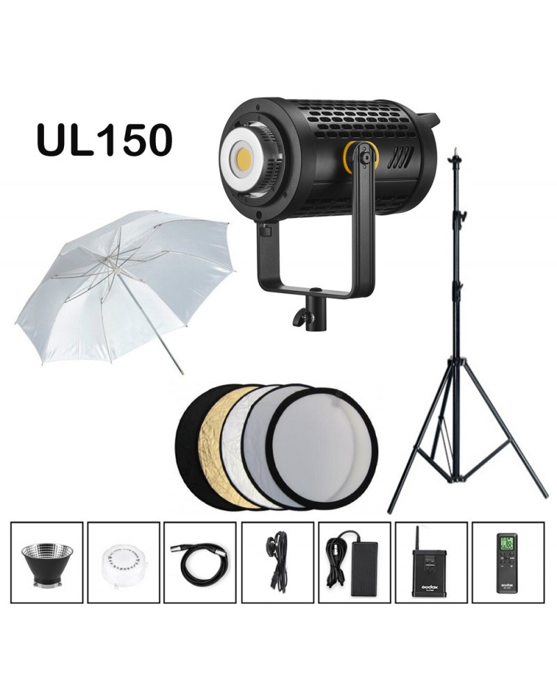 The Godox UL150 Silent LED Video Light is a daylight-balanced 150W LED monolite-style light source that features a fanless cooling design for silent operation. By eliminating unwanted noise during use, this LED light can benefit broadcasting, cinematography, online streaming, and other video applications with sound. The UL150 Silent LED Video Light is operated from an external controller, further helping to keep it compact and lightweight while its integrated umbrella mount and reflector mount make it compatible with the included reflector and a wide variety of light modifiers.