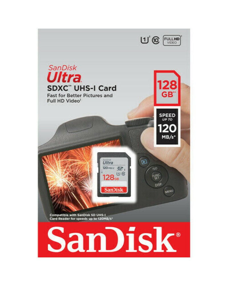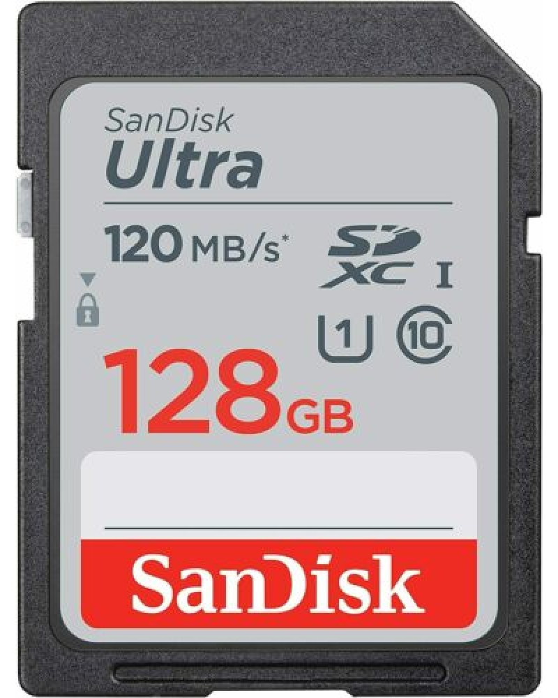 SanDisk Ultra. Capacity: 128 GB, Flash card type: SDHC, Flash memory class: Class 10, Internal memory type: UHS-I, Read speed: 120 MB/s, UHS Speed Class: Class 1 (U1), Video Speed Class: V10. Protection features: Shock resistant, Temperature proof, Waterproof, X-ray proof, Product colour: Black