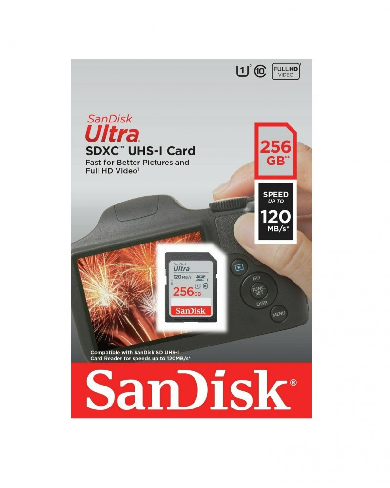 With SanDisk Ultra UHS-I cards you'll benefit from faster downloads, high capacity and better performance to capture and store 256GB of high quality pictures and Full HD video. Take advantage of ultra-fast read speeds of 120MB/s to save time moving photos and videos from the card to your computer. They are water-proof, temperature proof, X-ray proof, shock proof and compatible with SDHC and SDXC digital devices.