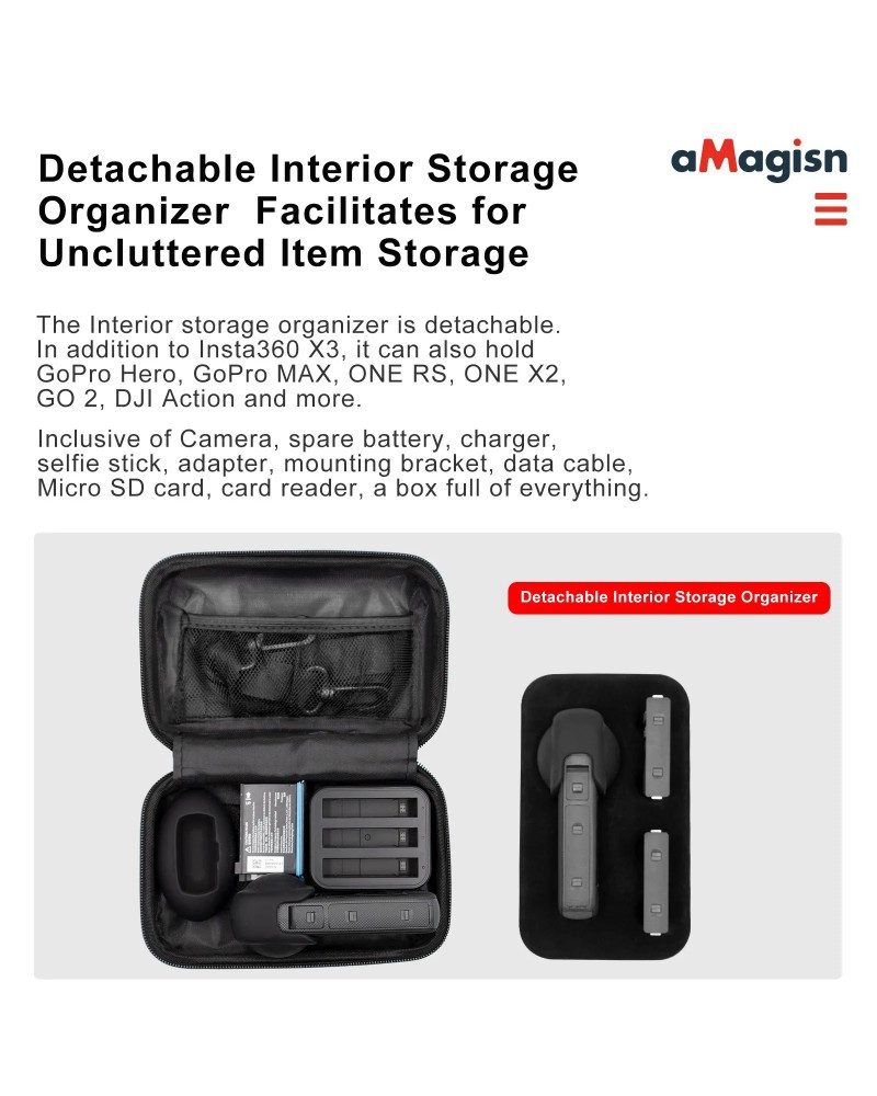 Detachable Inner Bracket: When the inner bracket is taken out, in addition to storing for insta360 X3, it can also store for ONE RS, for ONE X2, for DJI Action, etc.