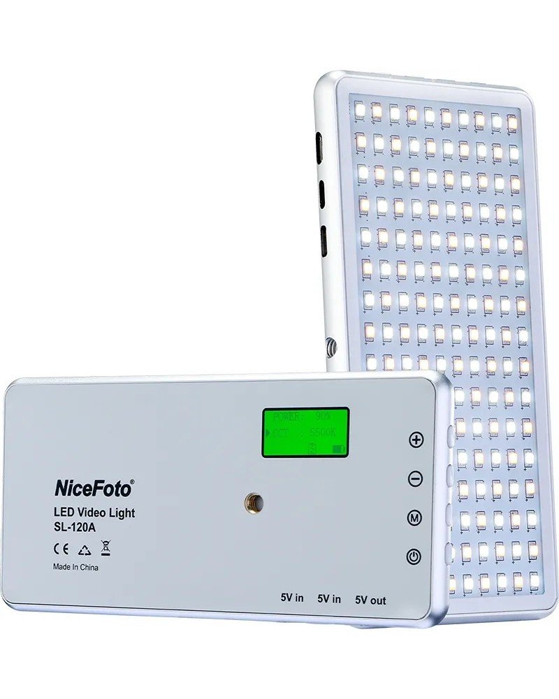 The Nicefoto SL-120A 12W Pocket Video LED Light adopts 160pcs LED beads, color temperature 3200-6500K, adjustable brightness among 0%-100%, CRI≥96; With Screen to display the color temperature, power, electricity, easy to operate. It can be used as a fill-in light, widely used in video shooting, interview, live streaming, professional photography.