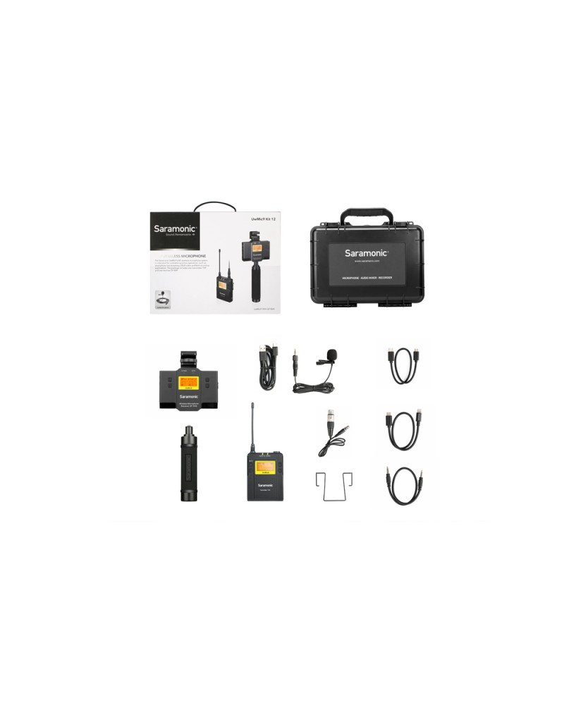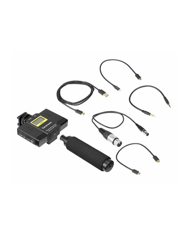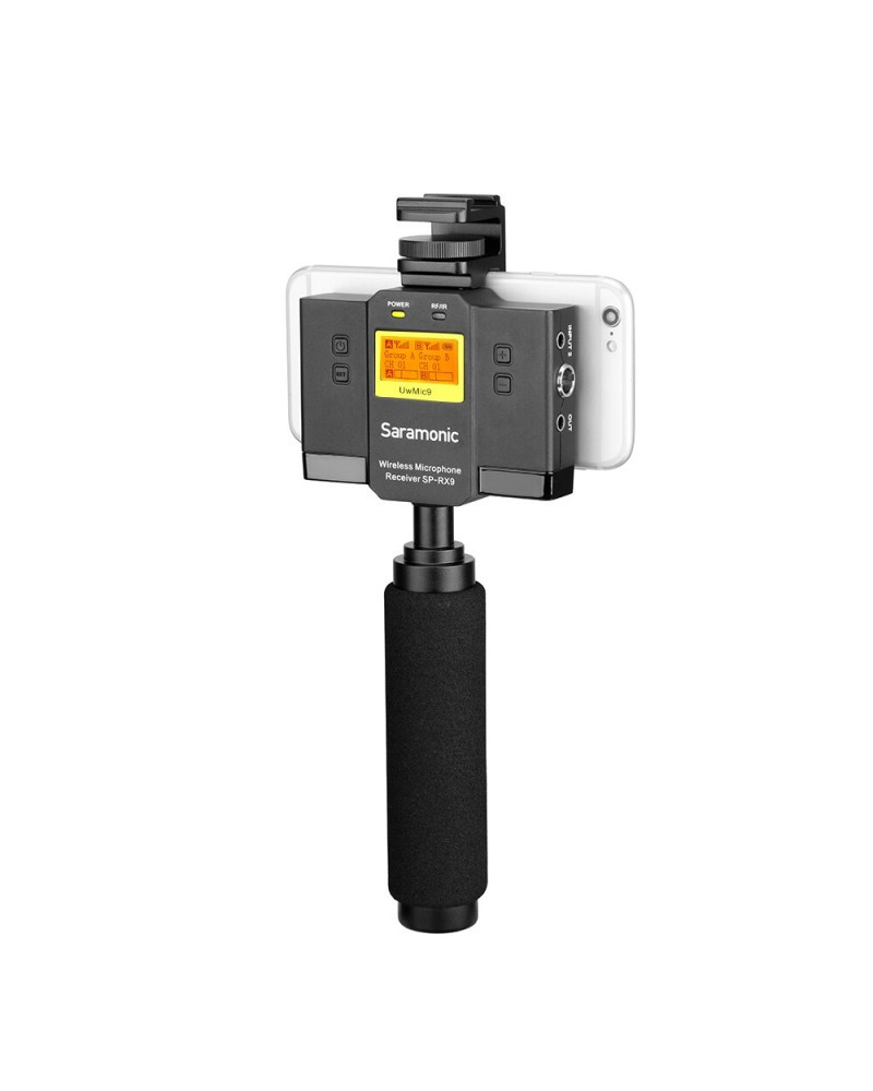 The Saramonic UwMic9 Camera-Mount Wireless Omni Lavalier Microphone System for Smartphones has everything you need to record one subject to your smartphone, tablet, computer, or camera. Ideal for a variety of audio-for-video applications, this bundle includes the SP-RX9 dual-channel wireless receiver/mixer, one bodypack transmitter, one omnidirectional lavalier microphone, a versatile cable set, and more. The receiver boasts a built-in clamp for securing your smartphone, and a removable padded hand grip for enhanced stabilization during handheld use.
