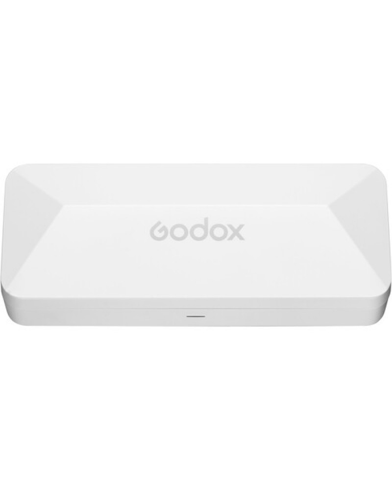 This white MoveLink Mini LT 2-Person Wireless Microphone System from Godox features a modular output design on the dual-channel receiver with three adapters for expanded connectivity, compatible with DSLR cameras, audio recorders, and iOS devices with Lightning ports. Included in the system are two clip-on transmitter units, each with an integrated omnidirectional microphone for improved audio pickup. Each component communicates to one another from up to 328' away.