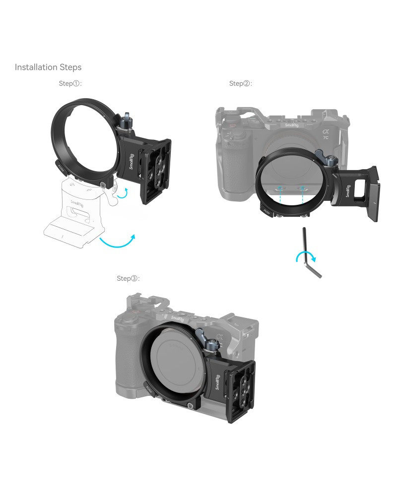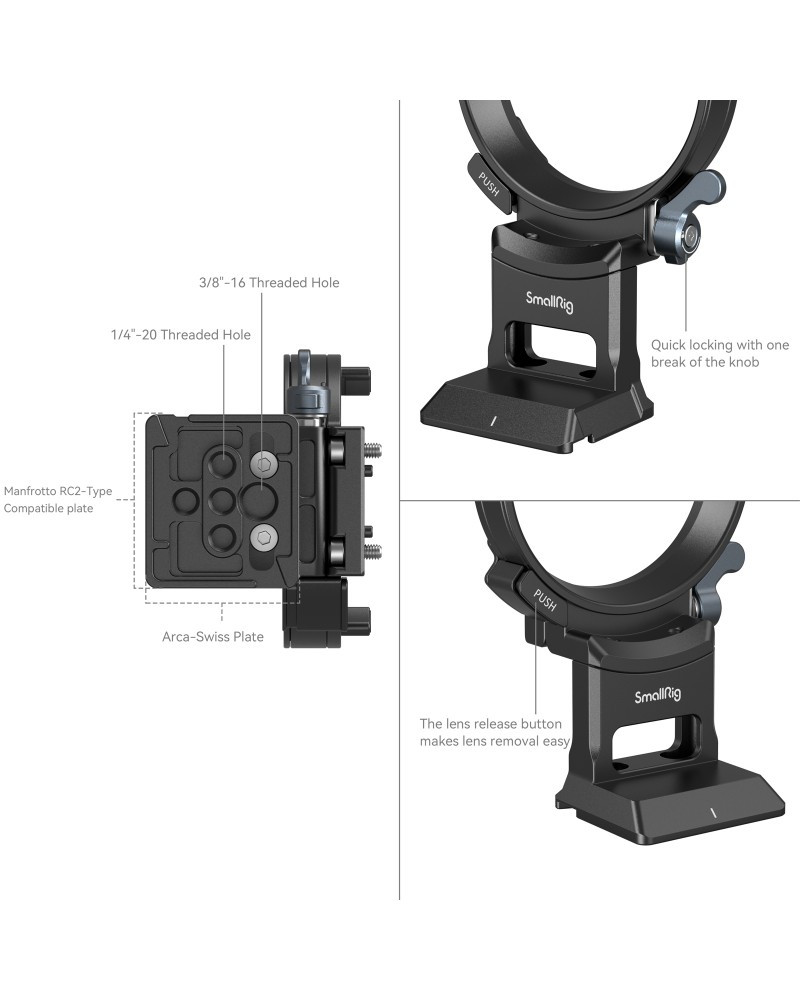 SmallRig Horizontal-to-Vertical Mount Plate for Sony Alpha 7 C II / Alpha 7 CR 4424 is designed to be used with Cage 4422 or Baseplate 4438 to quickly switch between horizontal and vertical shooting without adjusting the lens optical axis. It maintains full access to LCD flip screen and ports and features built-in pads that prevent scratches and twist. Compatible with Arca-type / Manfrotto RC2 tripod and DJI RS-series gimbals, the lens collar mount plate can rotate by 90 degrees by merely unlocking a knob to switch between horizontal and vertical shooting; its bottom 1/4"-20 and 3/8"-16 threaded holes also support other quick-release plates.