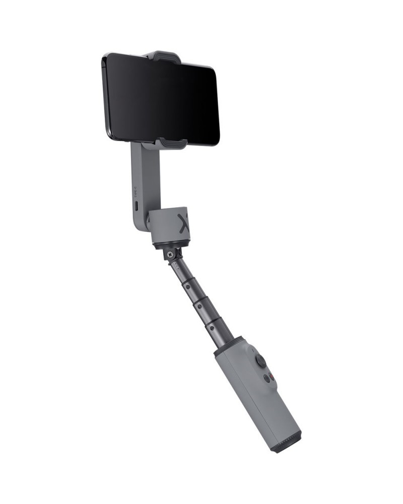 The Zhiyun Tech SMOOTH-X Smartphone Gimbal, in gray, is ultra-compact and yet made even more compact by its folding design. However, while it's truly a pocket-size gimbal, it can also be extended out telescopically, in which case it functions as a gimbal plus selfie stick, allowing you to capture 2-axis stabilized footage and photos, including group shots, from more angles.